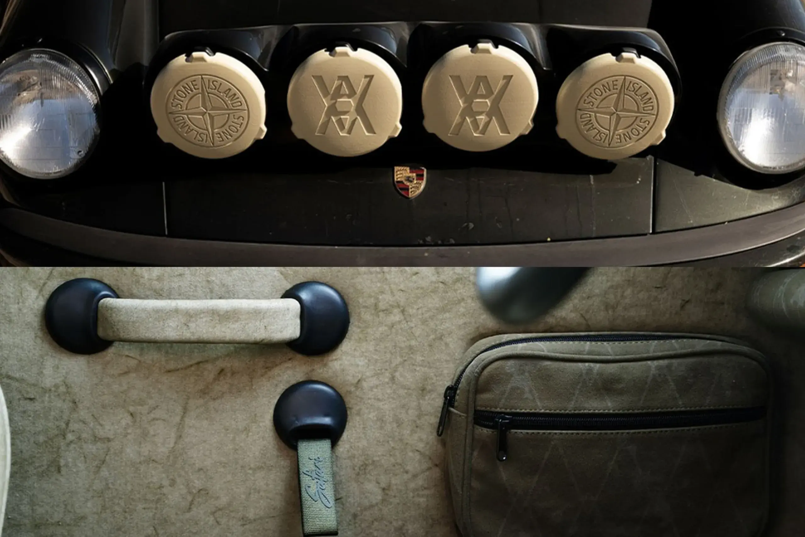 Porsche 911 Turbo (1986) → трансформований у Safari 911: піднята підвіска, додаткове освітлення, захист днища, інтер’єр із архівних тканин Stone Island.