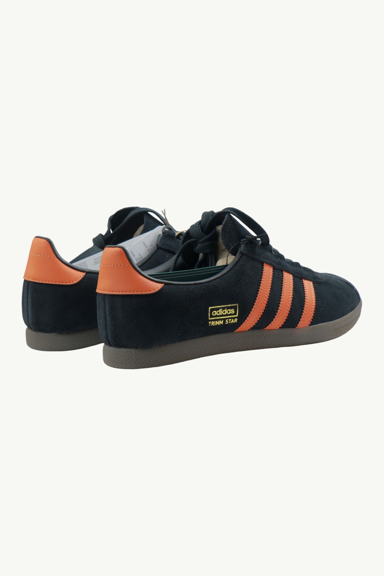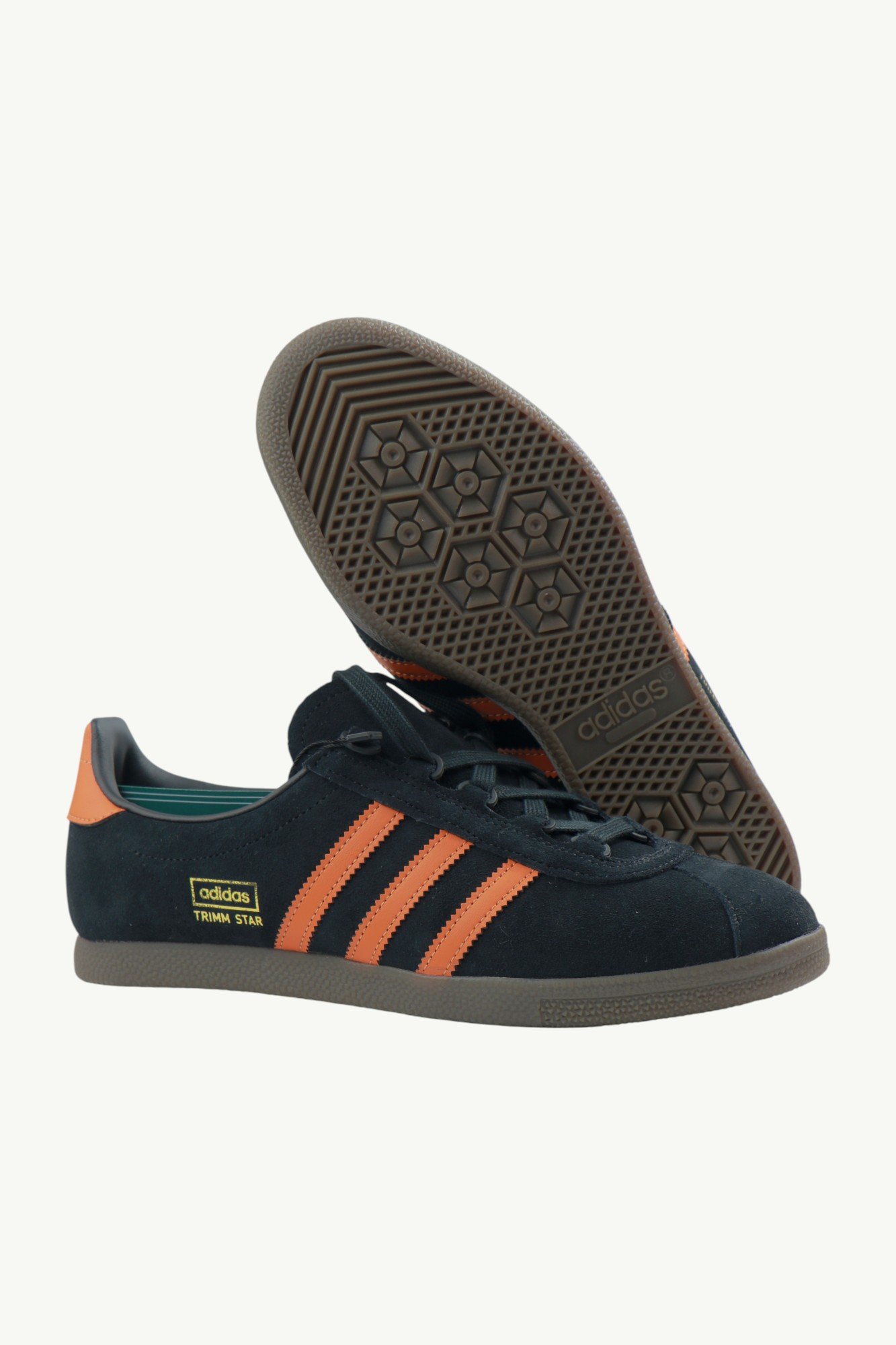 Контрастні помаранчеві три смуги та задник створюють виразний акцент, а золотий напис Trimm Star підкреслює архівне походження моделі. Гумова підошва природного відтінку гарантує надійне зчеплення та довговічність.