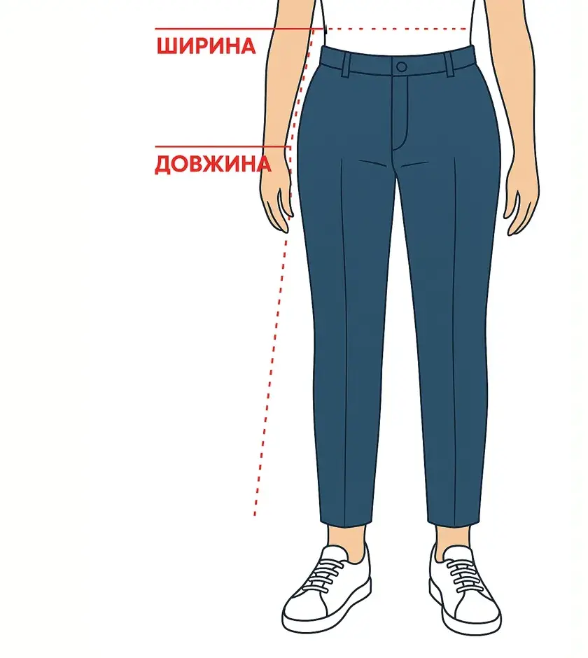 - Довжина штанів — від краю вниз по зовнішньому шву
