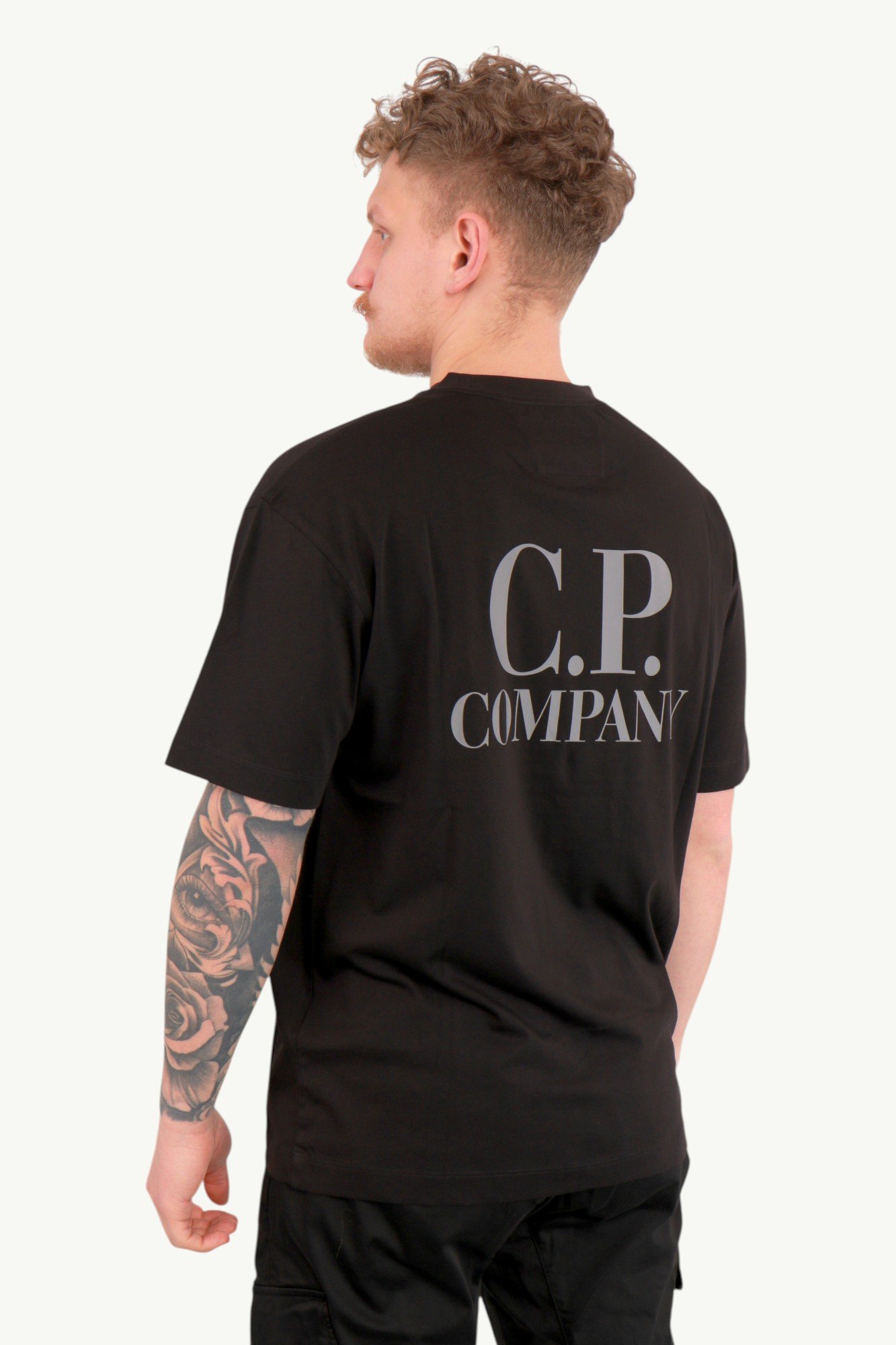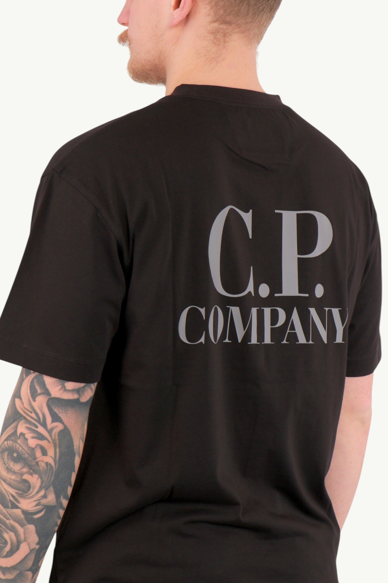 На грудях розташований лаконічний логотип C.P. Company, який формує акуратний фронтальний акцент. Основний візуальний характер моделі створює великий printed graphics-принт на спині з фірмовим написом C.P. Company. Такий контраст між стриманим фасадом і виразною спинкою додає глибини образу.