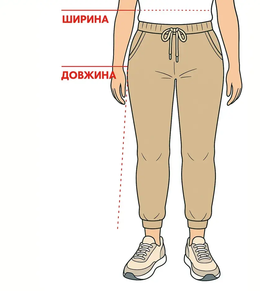 - Довжина штанів — від краю вниз по зовнішньому шву