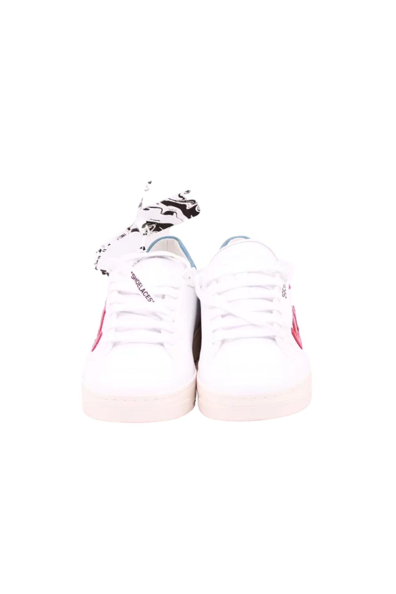 Кеди Off-White 2.0 Sneaker Calf Leather In White – арт. OMIA042R21 LEA002-0125 — Пара кросівок зі шнурівкою на кремовій гумовій підошві з фірмовою біркою на застібці має шкіряний верх із тисненим на язичку, червоною нашивкою зі стрілками та синім графічним принтом. Зовнішній шар створений зі шкіри, внутрішній шар з тканини та підошва з гуми.