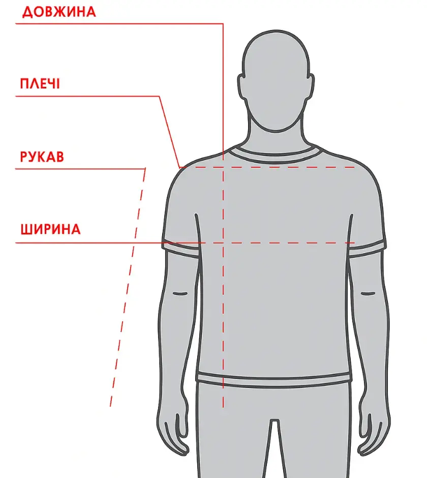 - Ширина — по грудях під проймами (значення ×2 = обхват).