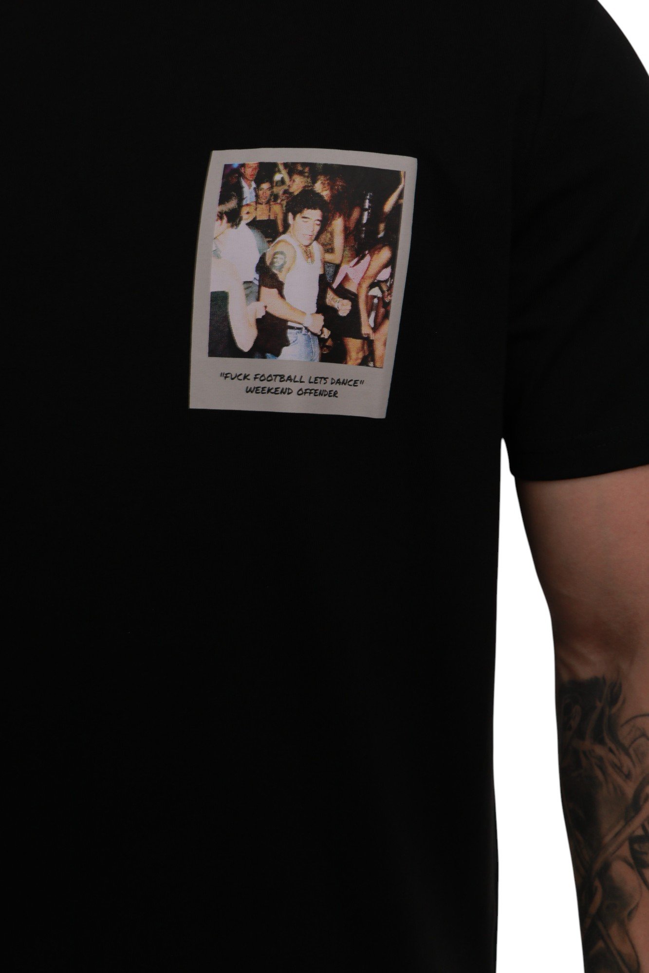 Weekend Offender Let’s Dance Graphic T-Shirt Black — це футболка, яка поєднує streetwear-естетику з іконою світового футболу. У центрі дизайну — рідкісна Polaroid-фотографія легендарного Дієго Марадони, зроблена у нічному клубі в Аргентині. Цей знімок відкриває маловідомий бік життя суперзірки — поза футбольним полем, у моменти свободи та безтурботності. Саме цей образ ідеально перегукується з духом бренду Weekend Offender: чесність, автентичність і бунтівна енергія.